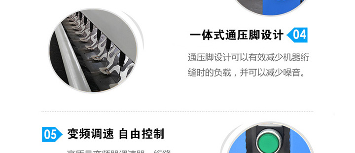 產品簡介:本機型設計結構合理,壓腳裝在壓腳套上,并用壓腳彈簧頂住,使其壓腳套緊貼減震裝置上,工作時減震裝置上的毛氈能起到很好的減震、降噪作用,改善了工作環境。