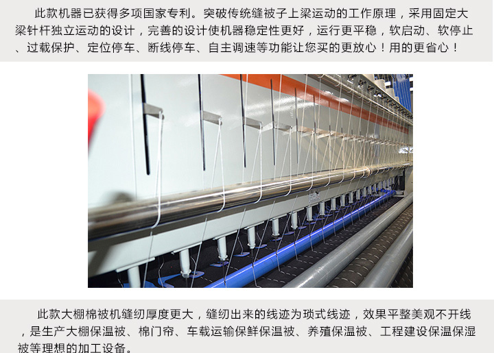 產品簡介:2米寬幅保溫被棉被機多針大棚被保溫被縫被機用途和特點:本設備是生產家庭用棉被、絲棉被、棉門簾、大棚保溫被、車載保溫被等最新型設備。2米寬幅保溫被棉被機已突破傳統單線鏈式結構,改用雙線平縫結構。
